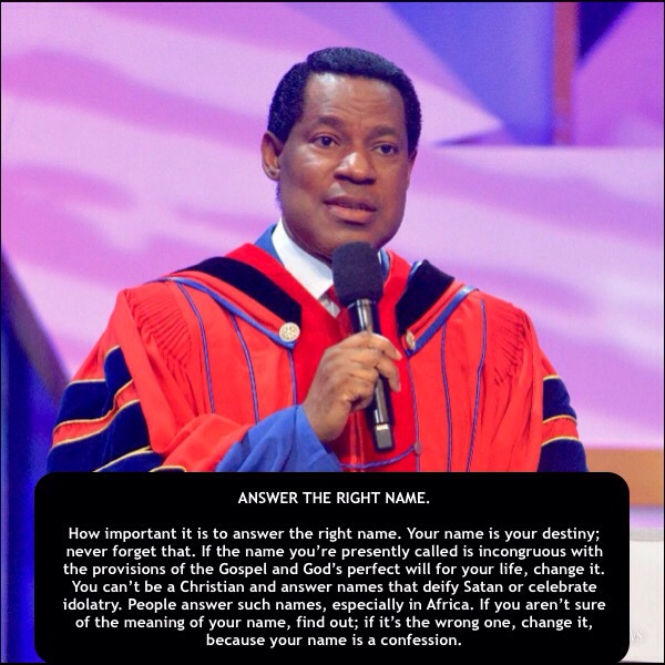 How important it is to answer the right name. Your name is your destiny; never forget that. If the name you’re presently called is incongruous with the provisions of the Gospel and God’s perfect will for your life, change it. You can’t be a Christian and answer names that deify Satan or celebrate idolatry. People answer such names, especially in Africa. If you aren’t sure of the meaning of your name, find out; if it’s the wrong one, change it, because your name is a confession.