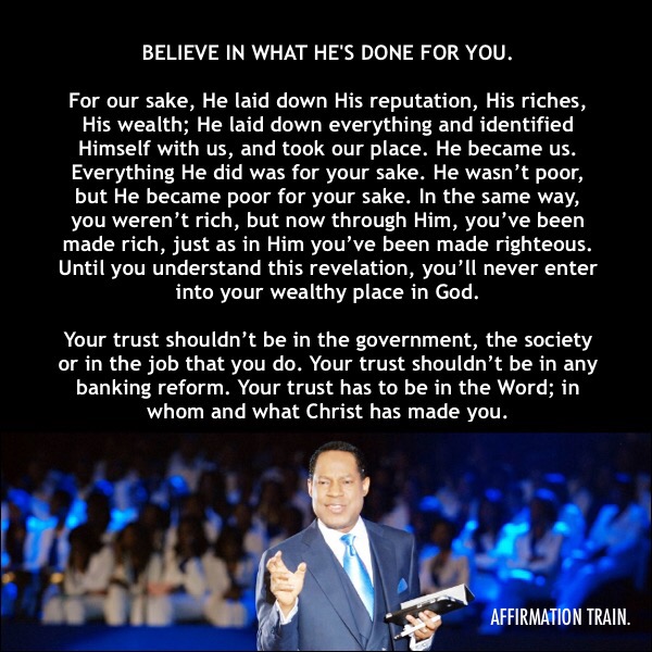 Your trust shouldn’t be in the government, the society or in the job that you do. Your trust shouldn’t be in any banking reform. Your trust has to be in the Word; in whom and what Christ has made you. He’s fulfilled His part. He said, “…Lo, I come (in the volume of the book it is written of me,) to do thy will, O God” (Hebrews 10:7). He already became poor so that you, through His poverty, might become rich. Now, you’re to step into what He’s done for you and made you. Believe in what He’s done for you, and take advantage of it.
