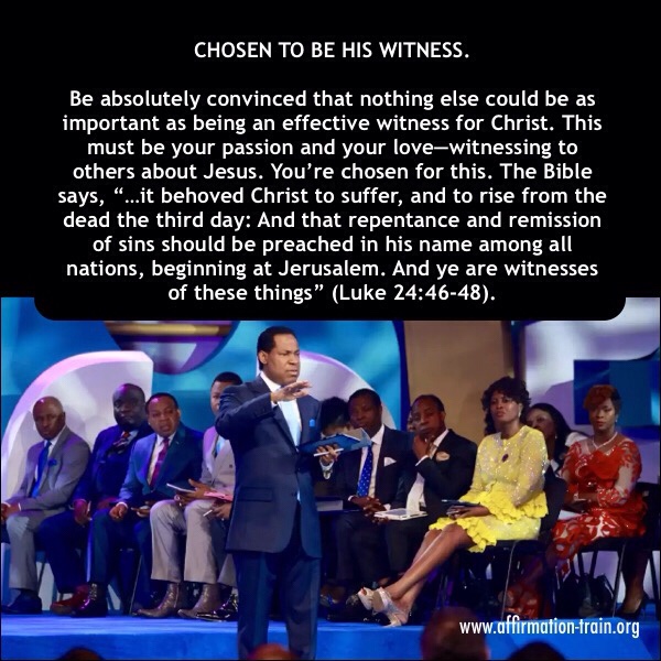 Be absolutely convinced that nothing else could be as important as being an effective witness for Christ. This must be your passion and your love—witnessing to others about Jesus. You’re chosen for this. The Bible says, “…it behoved Christ to suffer, and to rise from the dead the third day: And that repentance and remission of sins should be preached in his name among all nations, beginning at Jerusalem. And ye are witnesses of these things” (Luke 24:46-48).