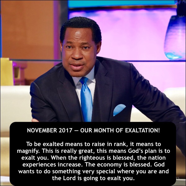 God said, November is the month of EXALTATION. To be exalted means to raise in rank, it means to magnify. This is really great, this means God’s plan is to exalt you. When the righteous is blessed, the nation experiences increase. The economy is blessed. God wants to do something very special where you are and the Lord is going to exalt you.