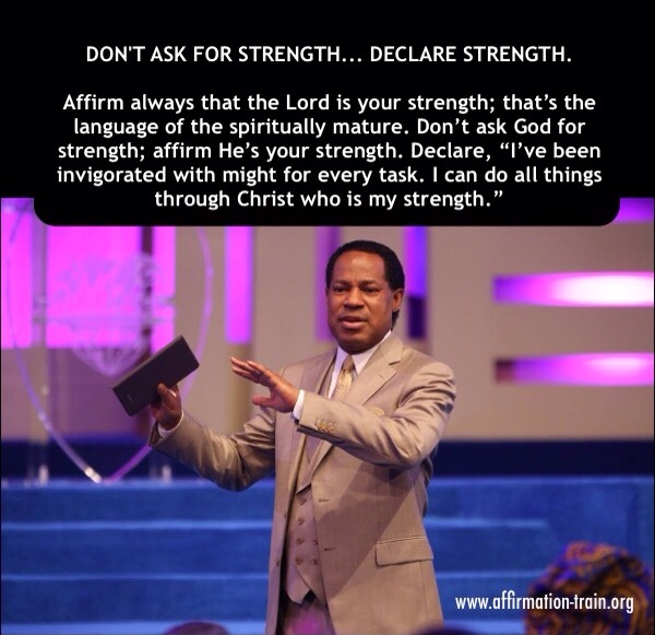 Affirm always that the Lord is your strength; that’s the language of the spiritually mature. Don’t ask God for strength; affirm He’s your strength. Declare, “I’ve been invigorated with might for every task. I can do all things through Christ who is my strength.”