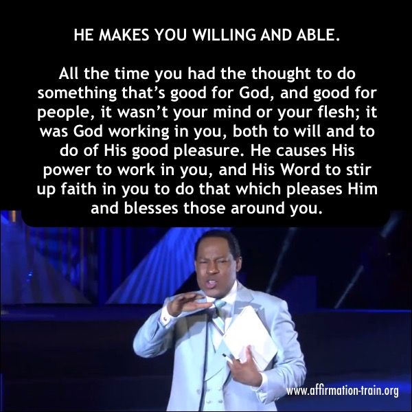 All the time you had the thought to do something that’s good for God, and good for people, it wasn’t your mind or your flesh; it was God working in you, both to will and to do of His good pleasure. He causes His power to work in you, and His Word to stir up faith in you to do that which pleases Him and blesses those around you.