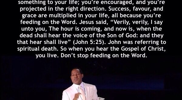 The same way you eat food every day, and it nourishes your body, when you hear God’s Word every day, it does something to your life; you’re encouraged, and you’re projected in the right direction. Success, favour, and grace are multiplied in your life, all because you’re feeding on the Word. Jesus said, “Verily, verily, I say unto you, The hour is coming, and now is, when the dead shall hear the voice of the Son of God: and they that hear shall live” (John 5:25). John was referring to spiritual death. So when you hear the Gospel of Christ, you live. Don’t stop feeding on the Word. -VIDEOS-