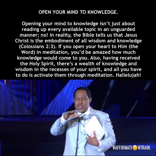 Opening your mind to knowledge isn’t just about reading up every available topic in an unguarded manner; no! In reality, the Bible tells us that Jesus Christ is the embodiment of all wisdom and knowledge (Colossians 2:3). If you open your heart to Him (the Word) in meditation, you’d be amazed how much knowledge would come to you. Also, having received the Holy Spirit, there’s a wealth of knowledge and wisdom in the recesses of your spirit, and all you have to do is activate them through meditation. Hallelujah!