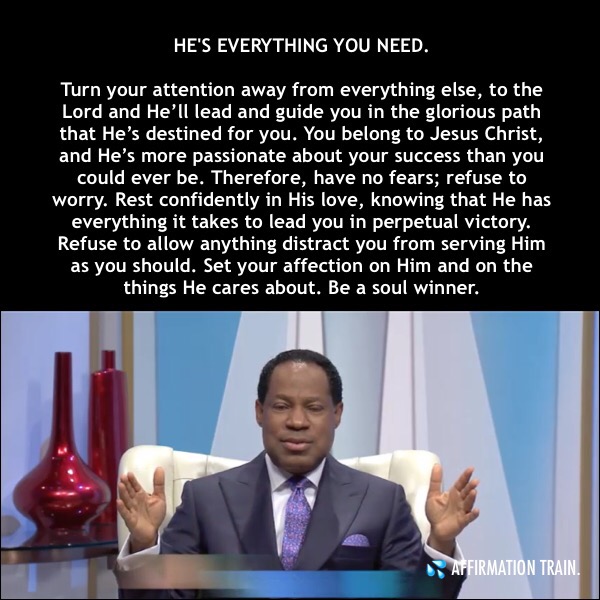 Turn your attention away from everything else, to the Lord and He’ll lead and guide you in the glorious path that He’s destined for you. You belong to Jesus Christ, and He’s more passionate about your success than you could ever be. Therefore, have no fears; refuse to worry. Rest confidently in His love, knowing that He has everything it takes to lead you in perpetual victory. Refuse to allow anything distract you from serving Him as you should. Set your affection on Him and on the things He cares about. Be a soul winner.