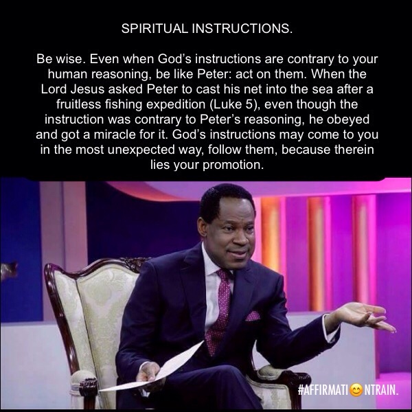 Be wise. Even when Godโs instructions are contrary to your human reasoning, be like Peter: act on them. When the Lord Jesus asked Peter to cast his net into the sea after a fruitless fishing expedition (Luke 5), even though the instruction was contrary to Peterโs reasoning, he obeyed and got a miracle for it. Godโs instructions may come to you in the most unexpected way, follow them, because therein lies your promotion.