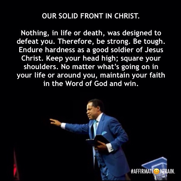 In Christianity, we have a solid front in Christ. The Spirit of God, through the Apostle Paul, referenced this in Colossians 2:5 (AMPC). It says, “For though I am away from you in body, yet I am with you in spirit, delighted at the sight of your [standing shoulder to shoulder in such] orderly array and the firmness and the SOLID FRONT AND STEADFASTNESS OF YOUR FAITH IN CHRIST [that leaning of the entire human personality on Him in absolute trust and confidence in His power, wisdom, and goodness].” In the face of daunting challenges and oppositions, we don’t chicken out or give in; rather, we face them head-on, because we’re bold and courageous. We’re victors in Christ Jesus.