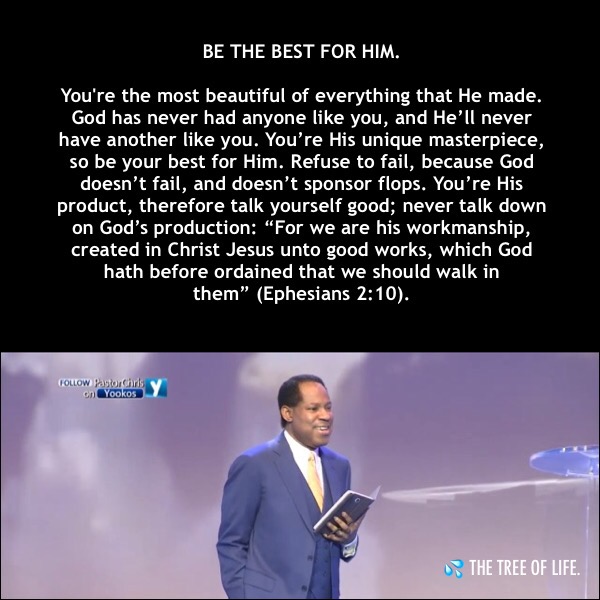 Not only does God love you, He likes you, because you’re the most beautiful of everything that He made. God has never had anyone like you, and He’ll never have another like you. You’re His unique masterpiece, so be your best for Him. Refuse to fail, because God doesn’t fail, and doesn’t sponsor flops. You’re His product, therefore talk yourself good; never talk down on God’s production: “For we are his workmanship, created in Christ Jesus unto good works, which God hath before ordained that we should walk in them” (Ephesians 2:10).