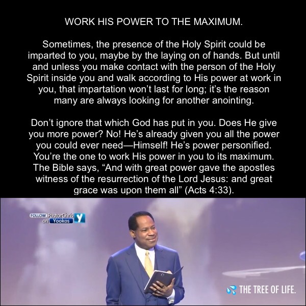 Sometimes, the presence of the Holy Spirit could be imparted to you, maybe by the laying on of hands. But until and unless you make contact with the person of the Holy Spirit inside you and walk according to His power at work in you, that impartation won’t last for long; it’s the reason many are always looking for another anointing.