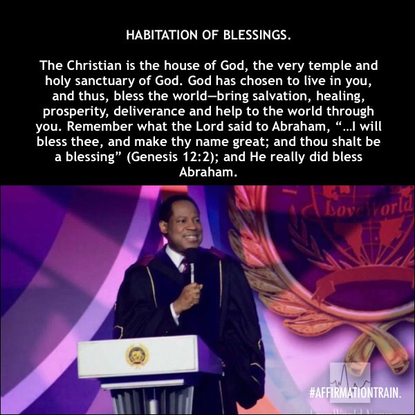 The Christian is the house of God, the very temple and holy sanctuary of God. God has chosen to live in you, and thus, bless the world—bring salvation, healing, prosperity, deliverance and help to the world through you. Remember what the Lord said to Abraham, “…I will bless thee, and make thy name great; and thou shalt be a blessing” (Genesis 12:2); and He really did bless Abraham.