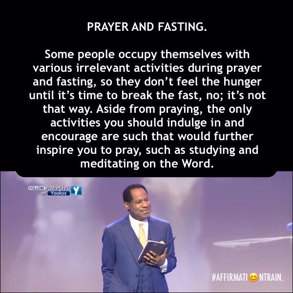 Some people occupy themselves with various irrelevant activities during prayer and fasting, so they don’t feel the hunger until it’s time to break the fast, no; it’s not that way. Aside from praying, the only activities you should indulge in and encourage are such that would further inspire you to pray, such as studying and meditating on the Word.