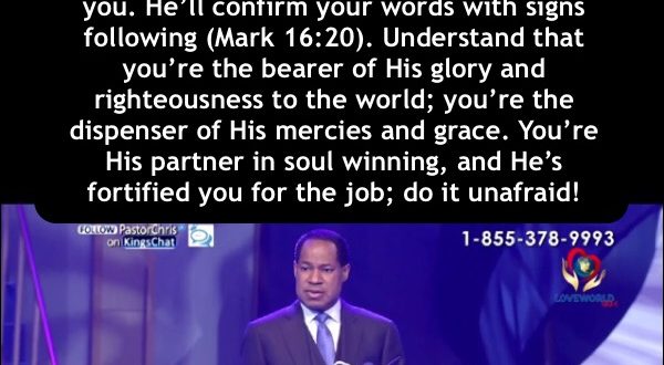 Therefore, be bold to preach the Word everywhere and to everyone. The Holy Spirit in you will speak through you. He’ll confirm your words with signs following (Mark 16:20). Understand that you’re the bearer of His glory and righteousness to the world; you’re the dispenser of His mercies and grace. You’re His partner in soul winning, and He’s fortified you for the job; do it unafraid! -SEE VIDEOS-