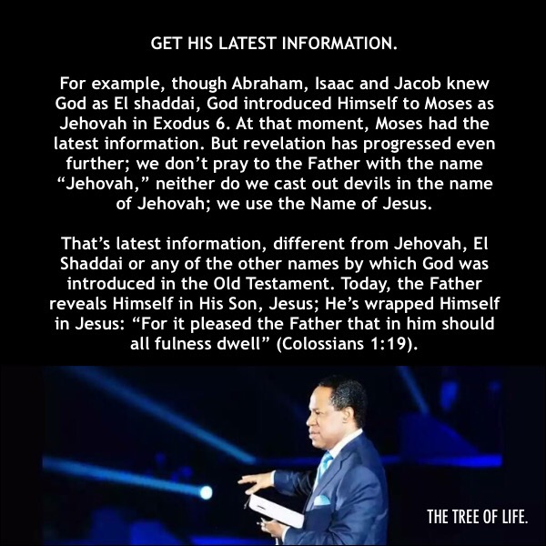 For example, though Abraham, Isaac and Jacob knew God as El shaddai, God introduced Himself to Moses as Jehovah in Exodus 6. At that moment, Moses had the latest information. But revelation has progressed even further; we don’t pray to the Father with the name “Jehovah,” neither do we cast out devils in the name of Jehovah; we use the Name of Jesus.