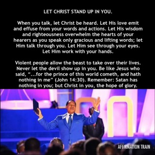 Violent people allow the beast to take over their lives. Never let the devil show up in you. Be like Jesus who said, “…for the prince of this world cometh, and hath nothing in me” (John 14:30). Remember: Satan has nothing in you; but Christ in you, the hope of glory.