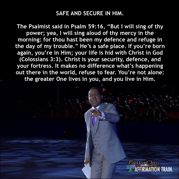 The Psalmist said in Psalm 59:16, “But I will sing of thy power; yea, I will sing aloud of thy mercy in the morning: for thou hast been my defence and refuge in the day of my trouble.” He’s a safe place. If you’re born again, you’re in Him; your life is hid with Christ in God (Colossians 3:3). Christ is your security, defence, and your fortress. It makes no difference what’s happening out there in the world, refuse to fear. You’re not alone: the greater One lives in you, and you live in Him.