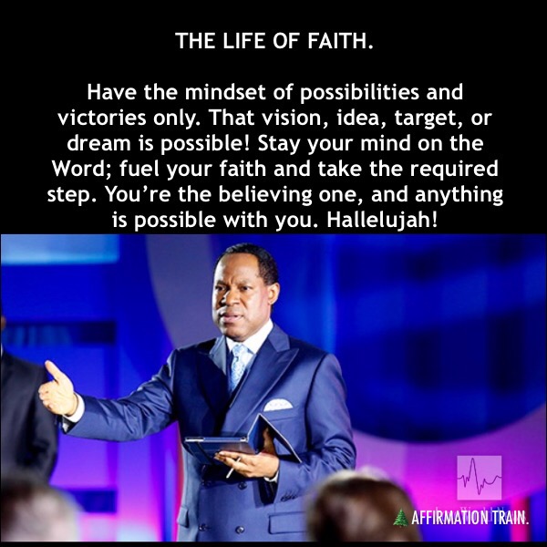Have the mindset of possibilities and victories only. That vision, idea, target, or dream is possible! Stay your mind on the Word; fuel your faith and take the required step. You’re the believing one, and anything is possible with you. Hallelujah!