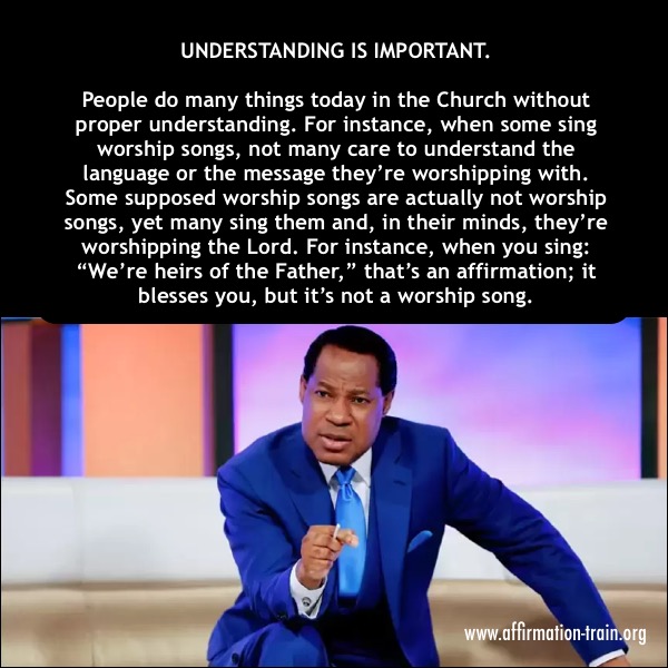 People do many things today in the Church without proper understanding. For instance, when some sing worship songs, not many care to understand the language or the message they’re worshipping with. Some supposed worship songs are actually not worship songs, yet many sing them and, in their minds, they’re worshipping the Lord. For instance, when you sing: “We’re heirs of the Father,” that’s an affirmation; it blesses you, but it’s not a worship song.