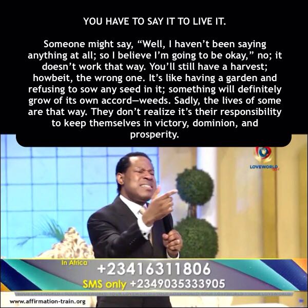 Understand that in this, there’s no middle ground. Someone might say, “Well, I haven’t been saying anything at all; so I believe I’m going to be okay,” no; it doesn’t work that way. You’ll still have a harvest; howbeit, the wrong one. It’s like having a garden and refusing to sow any seed in it; something will definitely grow of its own accord—weeds. Sadly, the lives of some are that way. They don’t realize it’s their responsibility to keep themselves in victory, dominion, and prosperity.